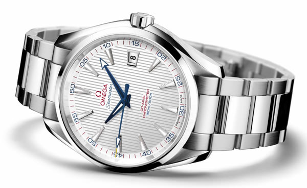 Das silberne Zifferblatt hat die vertikalen "Teak-Muster" Linien, die die Uhren in der Aqua Terra Kollektion. Gebürstet und poliert 18 Karat Weißgold Indizes markieren elf der Stunden; gibt es ein Datumsfenster bei 3 Uhr. Die Uhr verfügt über unverwechselbare facettierte blaue Hände, die mit Superluminova beschichtet sind, so dass sie gut lesbar bei allen Lichtverhältnissen zu machen; der zentrale Sekundenzeiger hat eine gelbe Spitze.